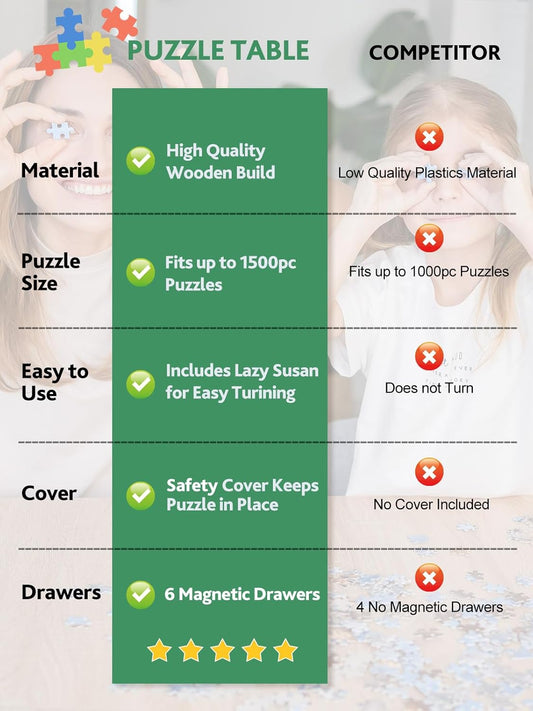 1500 Pieces Rotating Wooden Jigsaw Puzzle Board, 27"x35" Puzzle Board with 6 Drawers & Cover, 360 Degree Rotating Puzzle Storage Table for Adult